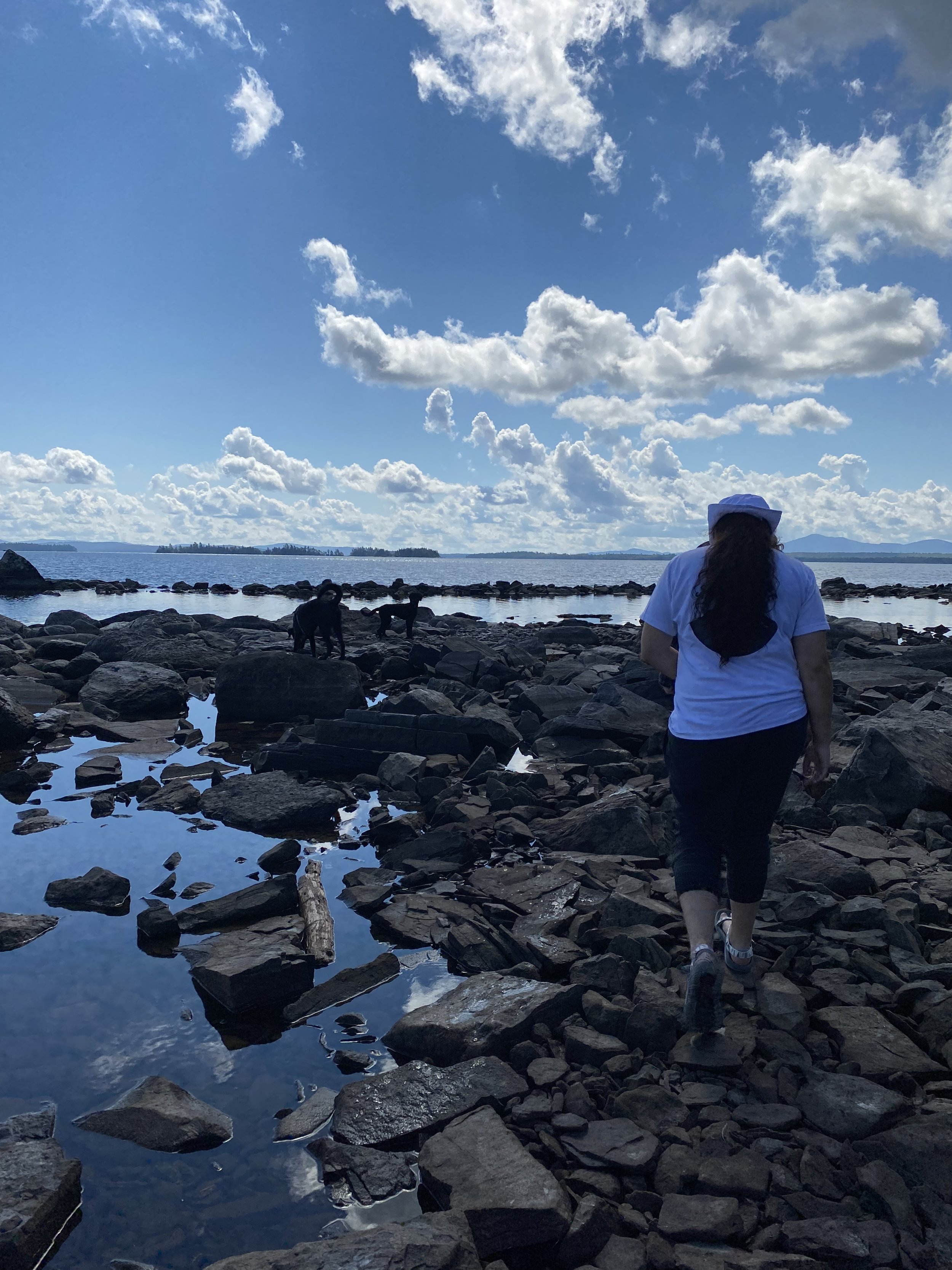 This trip was one of my favorite trips I took in 2021. One of my favorite parts of any trip is always the journey. As I said before, this amazing lake is about 5 hours from where I live. This kind of drive ahead of me I like to split it up. So, Thursday night I took the 2.5 hour drive to Liz’s house in South Maine. After having a quick dinner at our favorite spot, Gritty’s Tavern, that ended the first leg of the trip. The easy part really because Friday morning came the long haul. Bright and early at 5am Liz and I started the 3 hour trek to Moosehead Lake. The first few hours were easy, then the dogs started to get anxious. Every hour we would pull over and have a small break. It does make the trip longer but everyone appreciates the time to walk around and stretch. After we arrived at the lake we had to take the ferry, easy right? Well, the best case scenario is you take the ferry once. Which means we have to take all our bags, the dogs, and all the groceries we bought all in one trip. We were going to make that happen no matter how difficult. So one bag per person, one dog per person and both of us helping with the cooler. If you had seen us hauling all of that and handling our crazy dogs on leashes you would’ve thought we were crazy, but it was a success! We made it happen! Finally arriving we had one last hurdle, getting the dogs, the cooler, our bags and ourselves on one golf cart to the car. This is where the drama was.